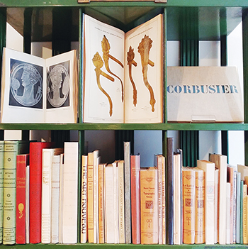 Au garde-à-vous sur les étagères, épaule contre épaule, les ouvrages les plus anciens bombent leur dos de cuir pour attirer les regards vers leur pièce de titre dorée il y a parfois plus de 5 siècles. De plein vélin ivoire cordé ou de maroquin rouge doublé de soie, les reliures s’ouvrent sur des lettrines ou capitales ornées racontant, pour certaines dans un ancien français, les aventures de Don Quichotte et d’Agrippa. Sur la bibliothèque voisine, le graphisme et les arts décoratifs des deux derniers siècles sont à l’honneur : l’Art nouveau, Le Corbusier, la Wiener Werkstätte et l’art japonais, mais aussi un manuel de typographie moderne, un album d’alphabets pour la pratique du « croquis-calque », ou des livres charmants dont le titre fait sourire, tel Les styles dans les arts expliqués en 12 causeries.