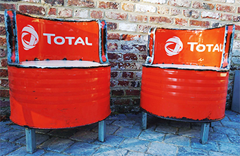 Côté mobilier, on se dit sans doute que s’asseoir sur un tonneau, ce n’est pas ce qu’il y a de plus confortable. Alors, rien de tel qu’un petit test pour vous convaincre du contraire. « Les vieux bidons ont une épaisseur plus importante, explique Philippe, tout en précisant que celle de l’assise est doublée pour plus de solidité. En moyenne, avec trois barils, on peut faire deux fauteuils ». Tout cela est très coloré et forcément décoré de la marque d’origine, Honda, Total, Gulf, Castrol…